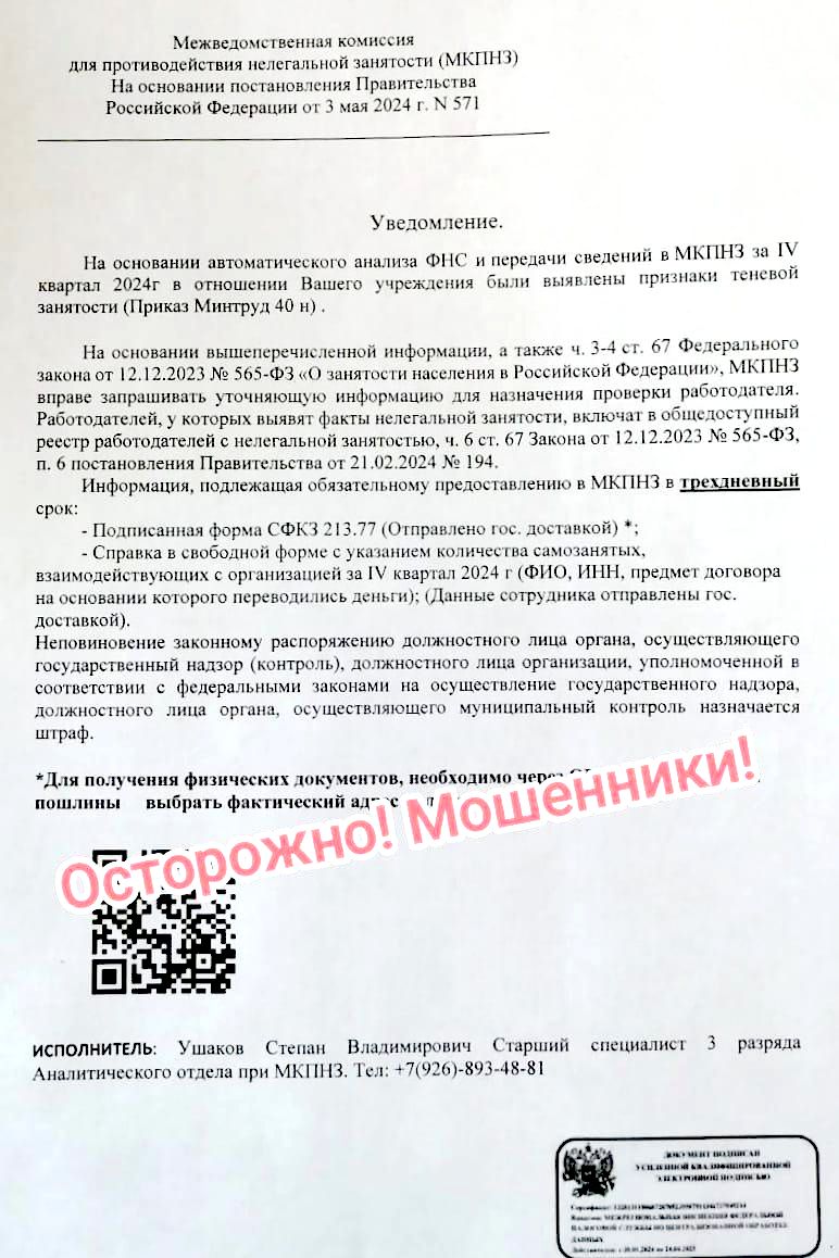 Под видом межведомственной комиссии по противодействию нелегальной занятости аферисты рассылают письма хозяйствующим субъектам о выявлении у них признаков теневой занятости. В рассылке при этом указываются QR-коды для оплаты пошлины.