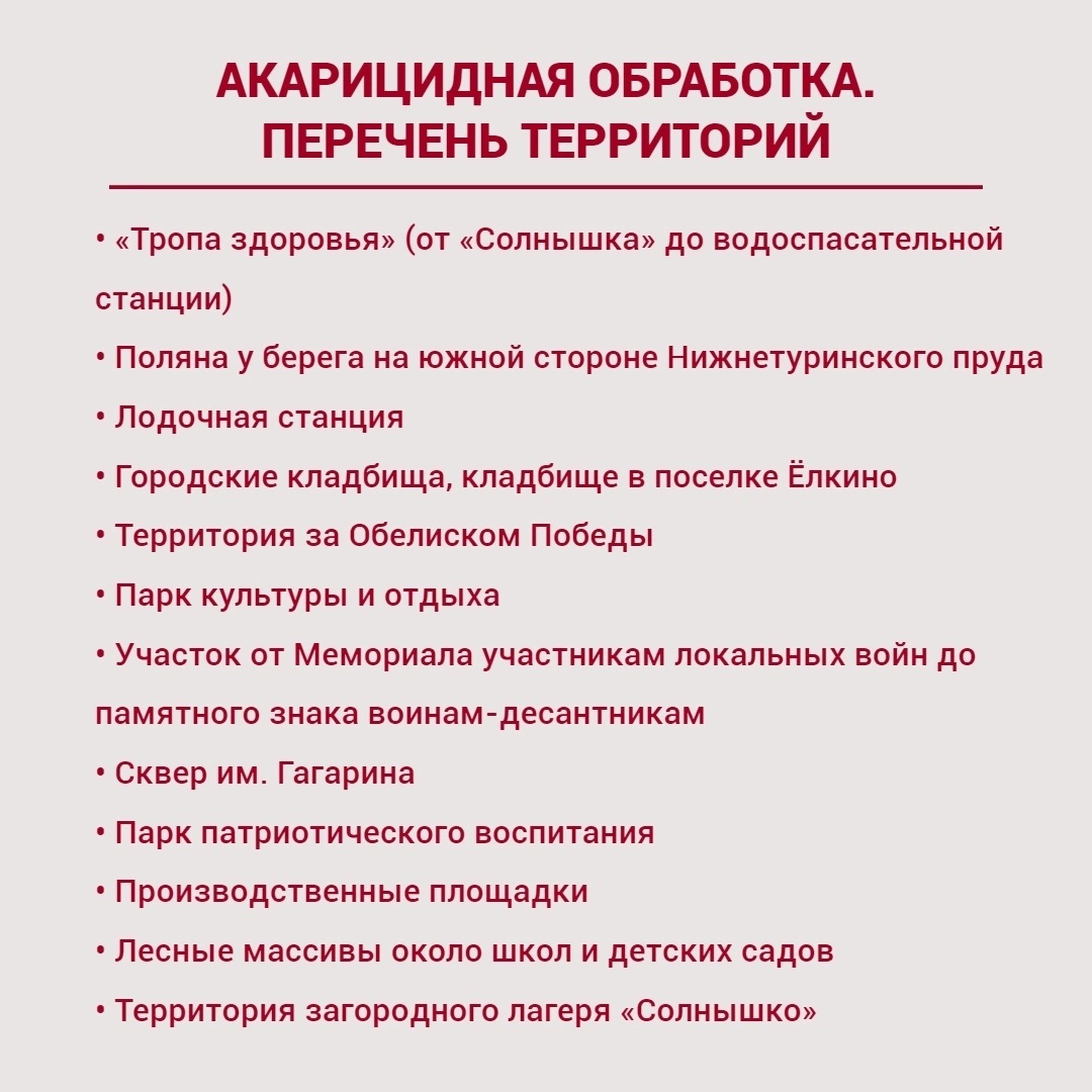 На проведение акарицидной обработки Управление городского хозяйства заключило контракт с подрядчиком – челябинской компанией «Космос». УГХ будет осуществлять контроль качества работ. Перечень обрабатываемых территорий представлен в карточках.