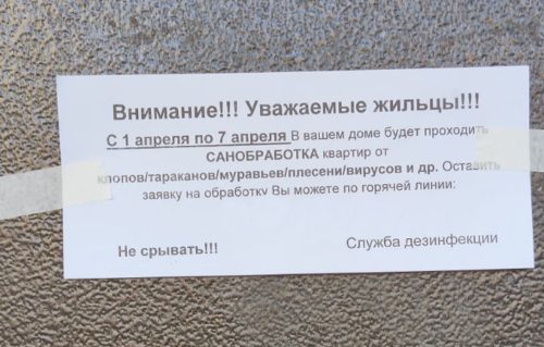 На днях на подъездах многоквартирных домов в Качканаре стали появились объявления о санитарной обработке квартир от тараканов, клопов и муравьёв. По информации специалистов, объявления не имеют отношения к городским организациям, их разместила коммерческая компания.