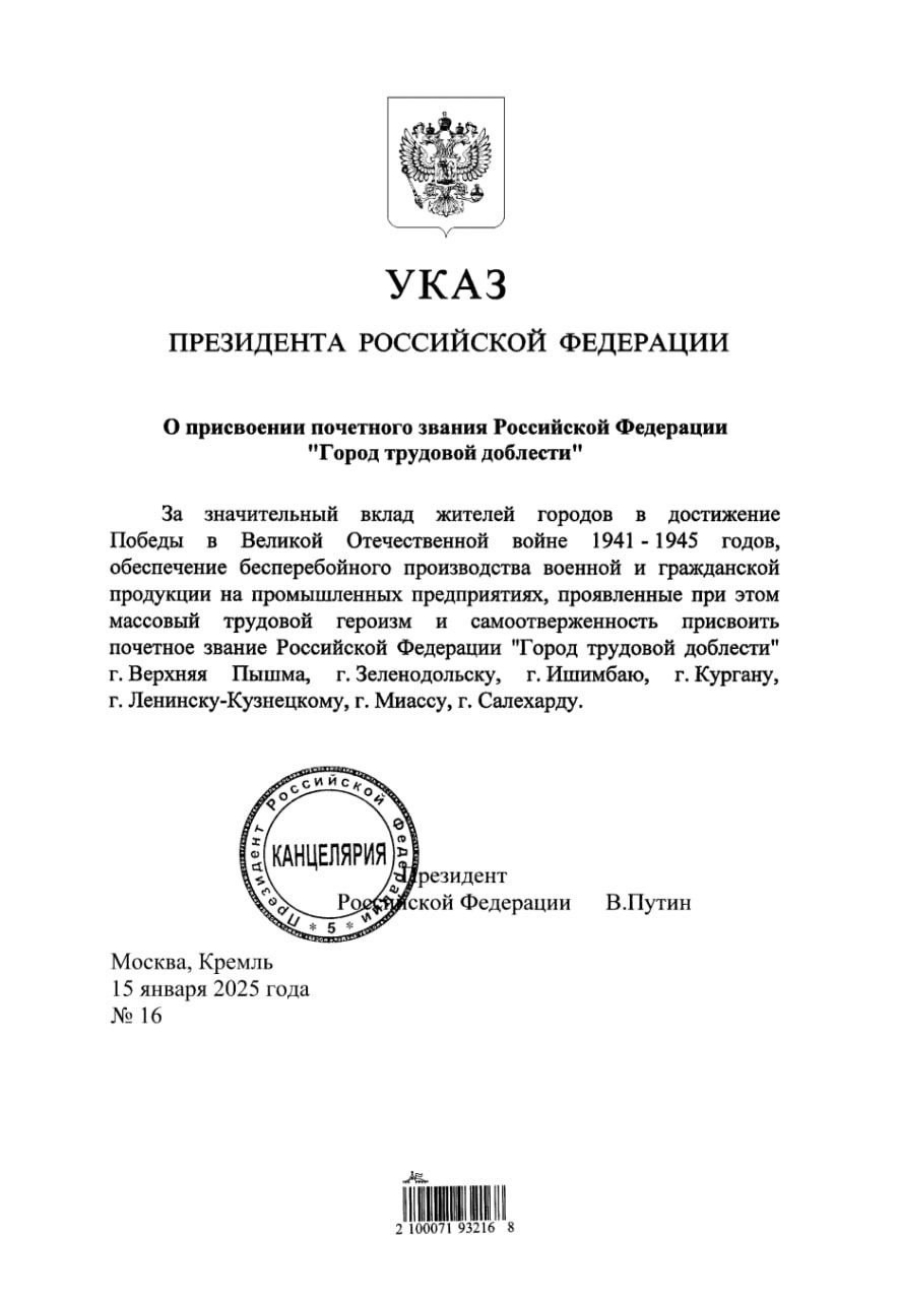 - За значительный вклад жителей городов в достижение Победы в Великой Отечественной войне 1941-1945 годов, обеспечение бесперебойного производства военной и гражданской продукции на промышленных предприятиях, проявленные при этом массовый трудовой героизм и самоотверженность присвоить почетное звание Российской Федерации «Город трудовой доблести» городу Верхняя Пышма, - сказано в документе.