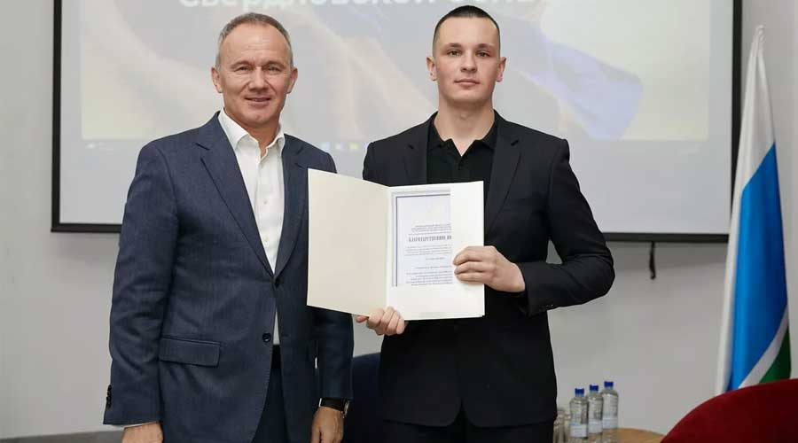 Вице-губернатор Свердловской области Олег Чемезов и студент УГМУ Арсений Кисляков