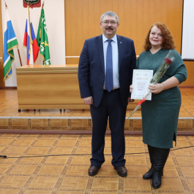 Глава города вручил диплом главному редактору газеты.
