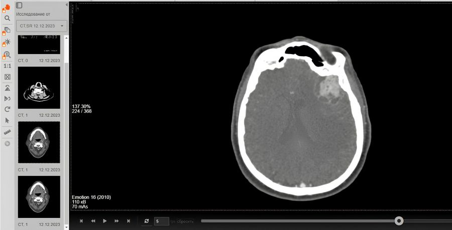 Пациентка поступила в больницу в тяжёлом состоянии: у неё отсутствовала речь. Томография позволила диагностировать отёк мозга и крупную, размером с грецкий орех, опухоль в зоне речевого центра коры головного мозга. В таком состоянии человек теряет способность говорить, но может понимать окружающих.